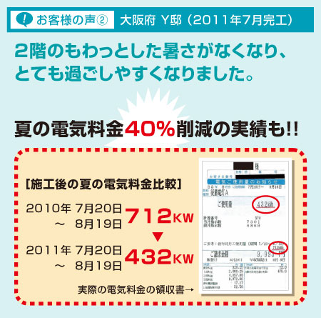 夏場の電気代が塗る前と比べて、なんと40%も削減でき、節電効果に驚いています。